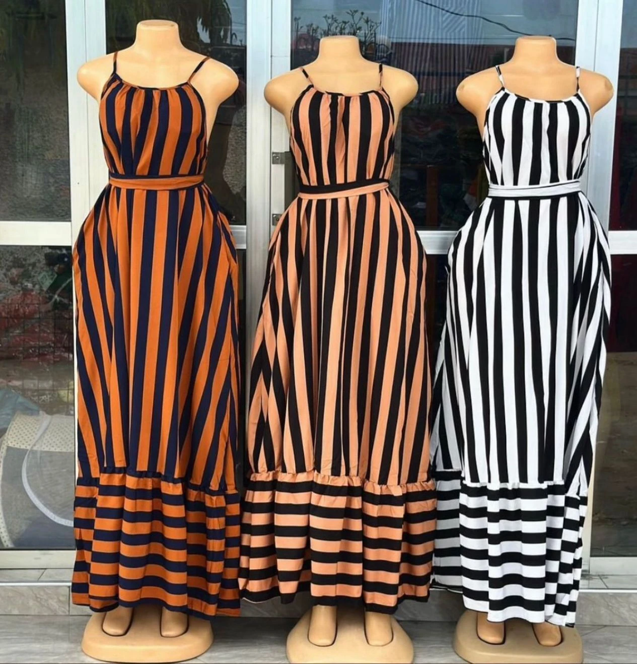 Limeundwa kwa vitambaa vyenye ubora mzuri, likiwa na rangi maridadi zinazovutia macho. Muundo wake wa mistari hutoa mwonekano wa kifahari na hulifanya gauni lifae kwa matumizi ya kila siku, matembezi, hafla ndogo au mikusanyiko ya kifamilia. Lina mkato unaokaa vizuri mwilini, likitoa faraja na kujiamini kwa mvaaji.