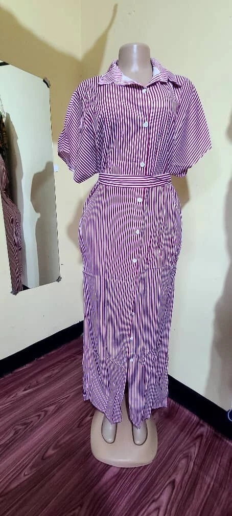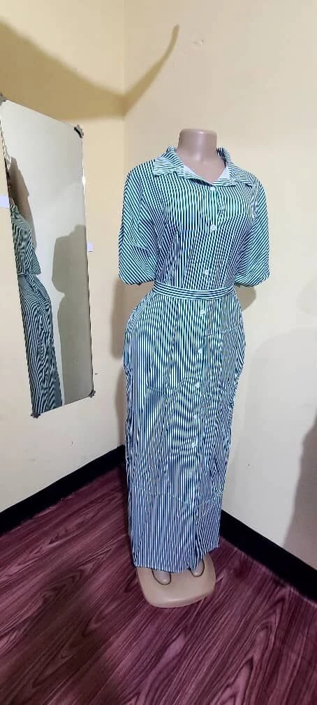 Gauni hili refu la mistari limeundwa kwa mtindo wa kisasa unaofaa kwa shughuli mbalimbali za kawaida au hafla zisizo rasmi. Muundo wake wa mistari mrefu unaongeza mwonekano wa urefu na mwembamba, ukikupa nafasi ya kujiamini mara unapovaa.