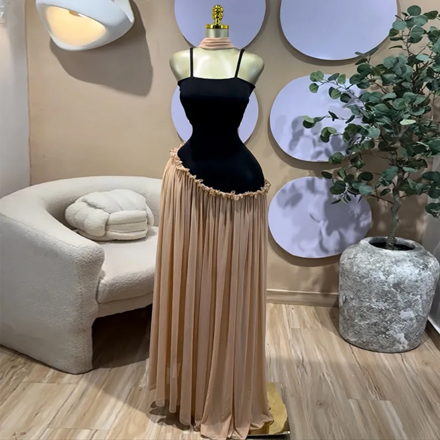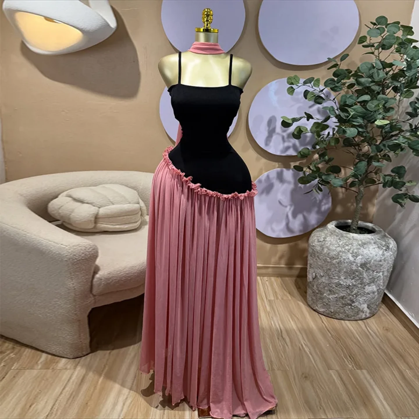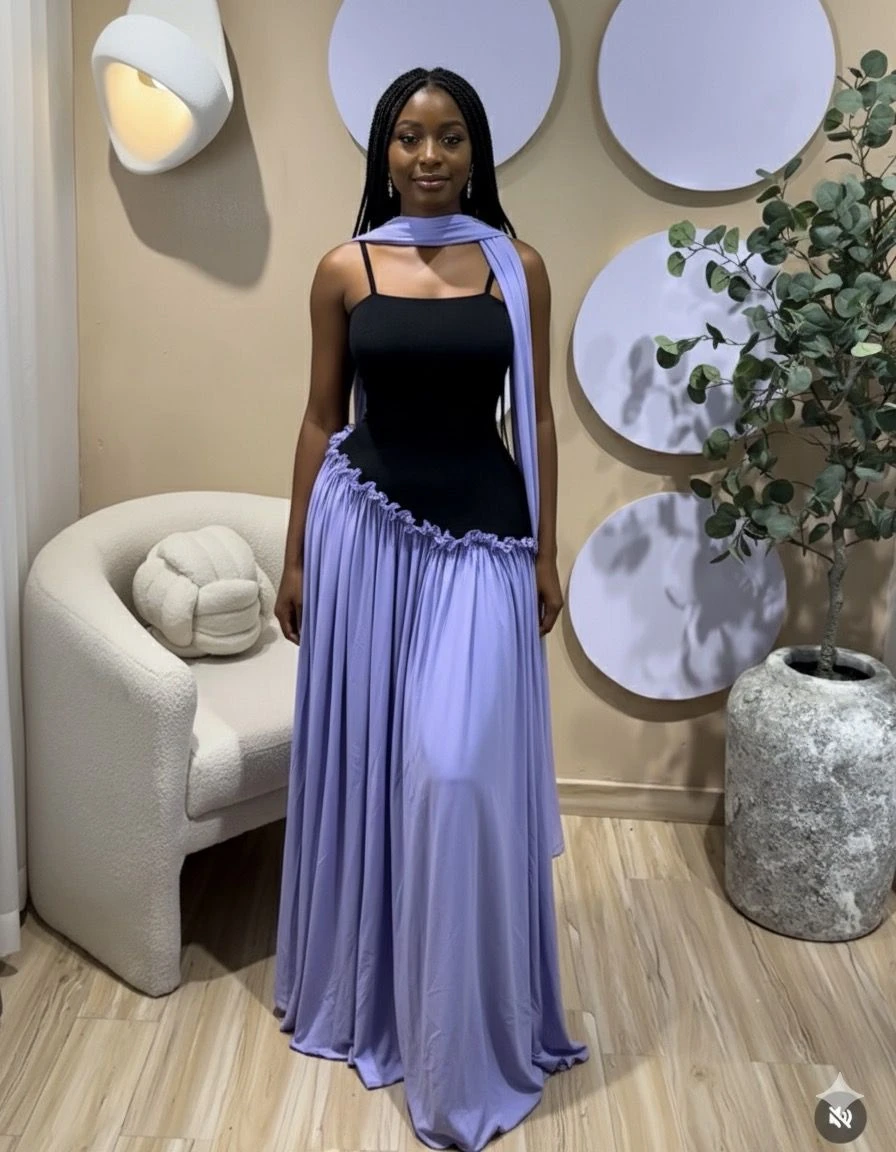 Gauni hili refu la kisasa limeundwa kwa muundo wa kuvutia wenye top ya rangi nyeusi inayokaa mwilini kwa ustadi, ikisisitiza umbo la kiuno na mwonekano wa kifahari. Sehemu ya chini imependezeshwa kwa kitambaa laini kilichokusanywa (pleated) kinachotoa mtiririko mzuri na mvuto wa kipekee, kikiwa na rangi tofauti kama pink, beige au purple kulingana na chaguo lako.