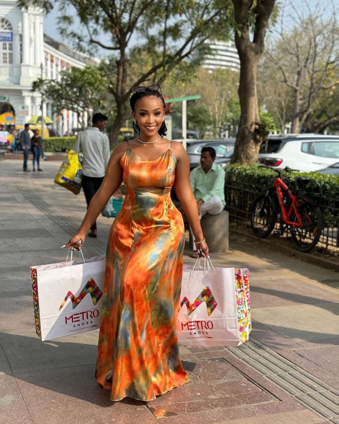 Gauni hili refu la kuvutia limeundwa kwa kitambaa cha satin chenye mng’aro laini kinachotoa muonekano wa kifahari na wa kipekee. Lina mchanganyiko wa rangi za machungwa, kijani na bluu zinazochanganyika kwa ustadi, zikitoa mwonekano wa kipekee na wa kisasa unaovutia macho mara moja.